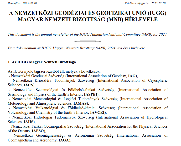 Az IUGG Magyar Nemzeti Bizottság (MNB) fontos célja a kvantitatív földtudományokkal foglalkozó magyar kutatók közötti információáramlás elősegítése, amely reményeink szerint hasznos tapasztalatok megosztásához, új együttműködések kialakulásához, és ezáltal a közösség kollektív erősödéséhez vezet. Ezzel a céllal összhangban az IUGG MNB egy tudományos hírlevél elindítása mellett döntött, amelyben az itthon és külföldön dolgozó magyar kutatók éves rendszerességgel számolhatnak be tudományos eredményeikről a közösségnek. A hírlevelek a Geomatikai Közlemények gondozásában jelennek meg (https://geomatika.epss.hun-ren.hu/).